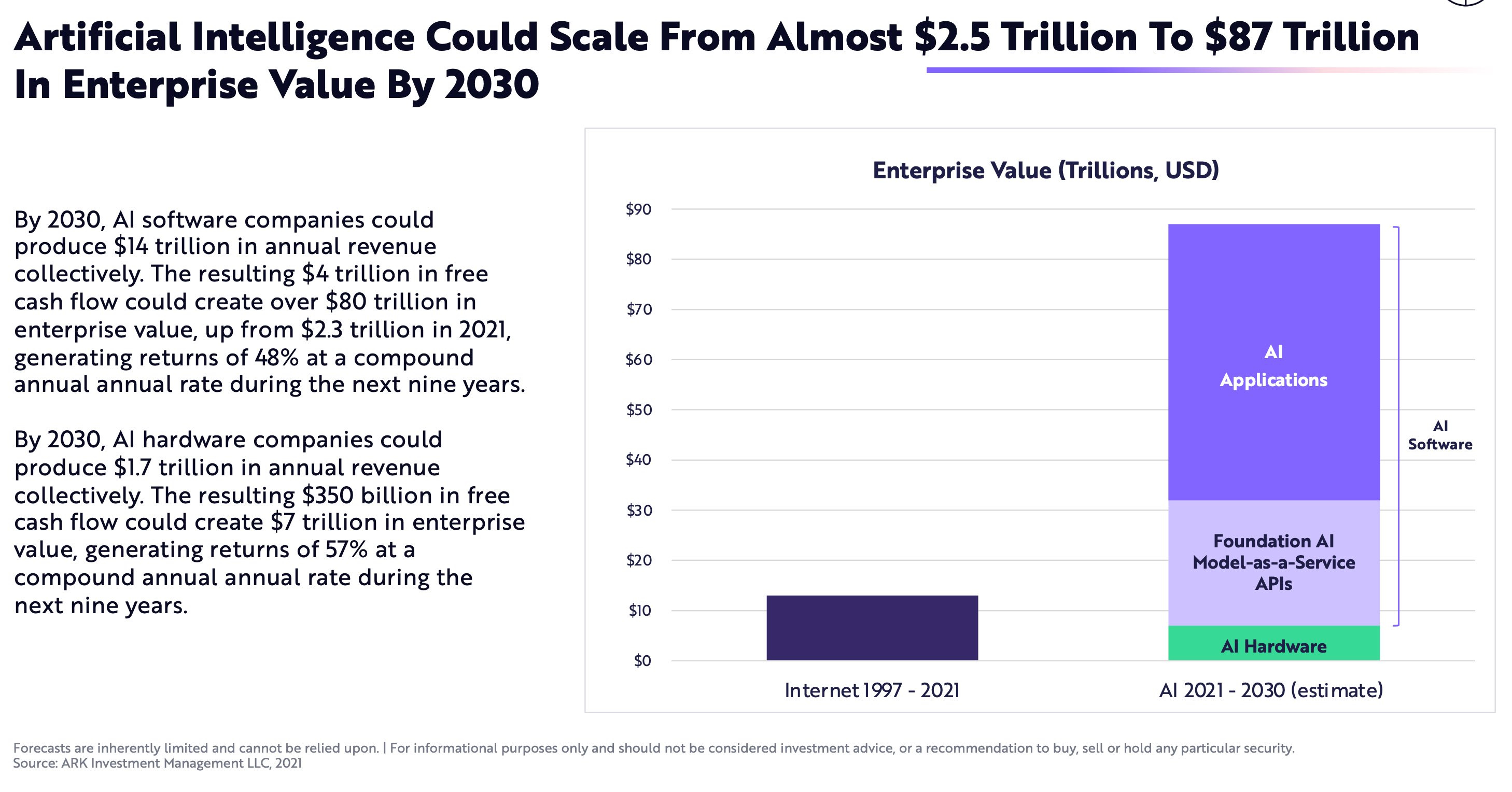A related chart—again by ARK Invest—shows AI value measured in the trillions of dollars within the next few years, with LLMs alone (‘Foundation AI Model-as-a-Service APIs’ like GPT-3 or DALL-E 2) forecast to generate business value of around $24 trillion (Twitter source, article source, slide deck source pp22):