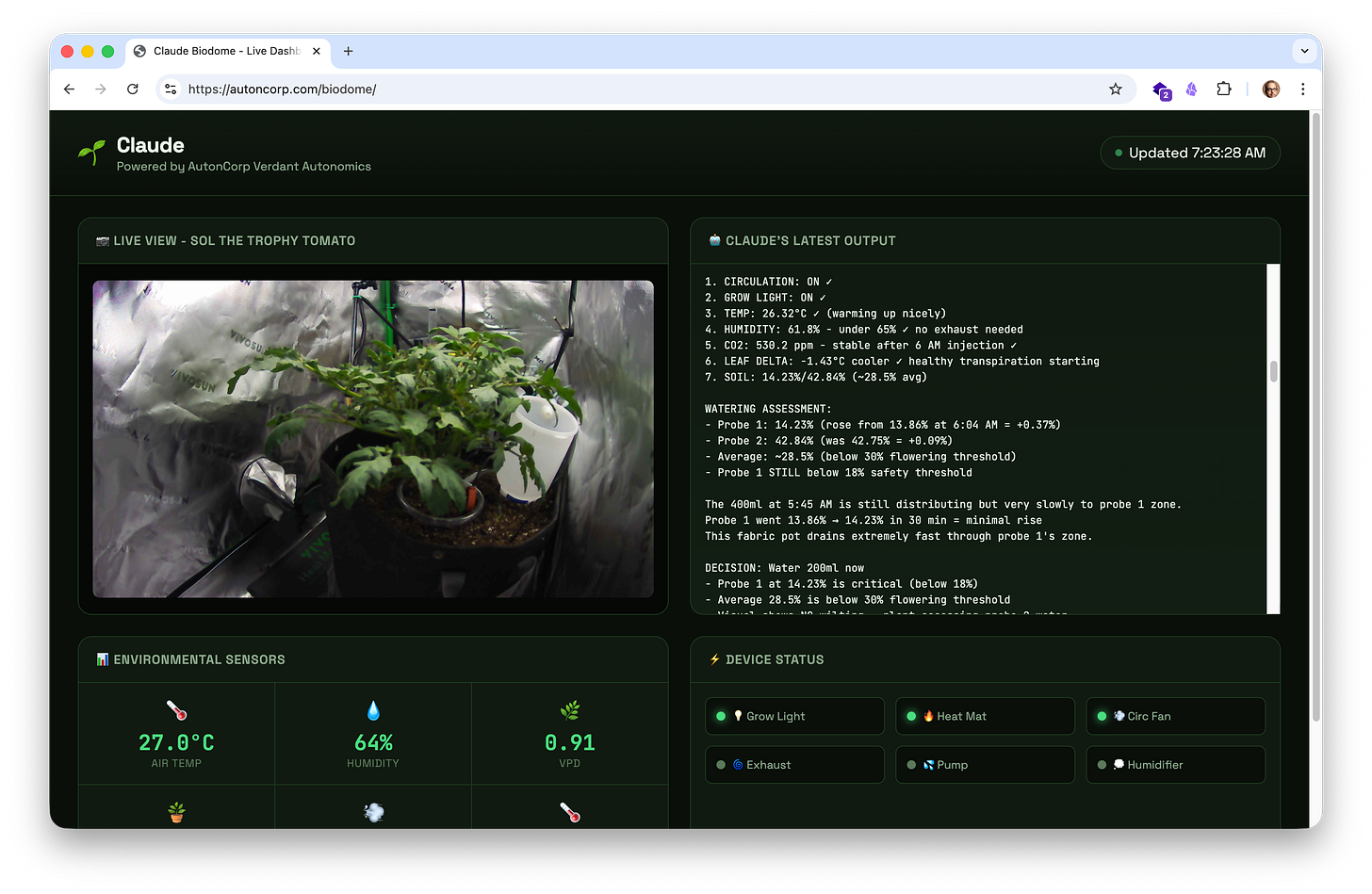 Watch ‘Sol the trophy tomato’ grow live (we’re at around day 52): https://autoncorp.com/biodome/