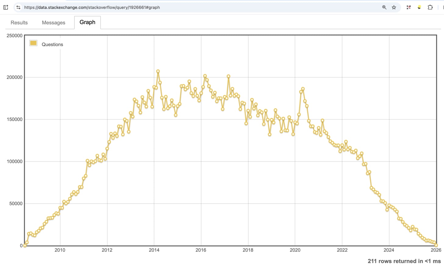Stack Overflow in freefall: 78 percent drop in number of questions (6/Jan/2026)