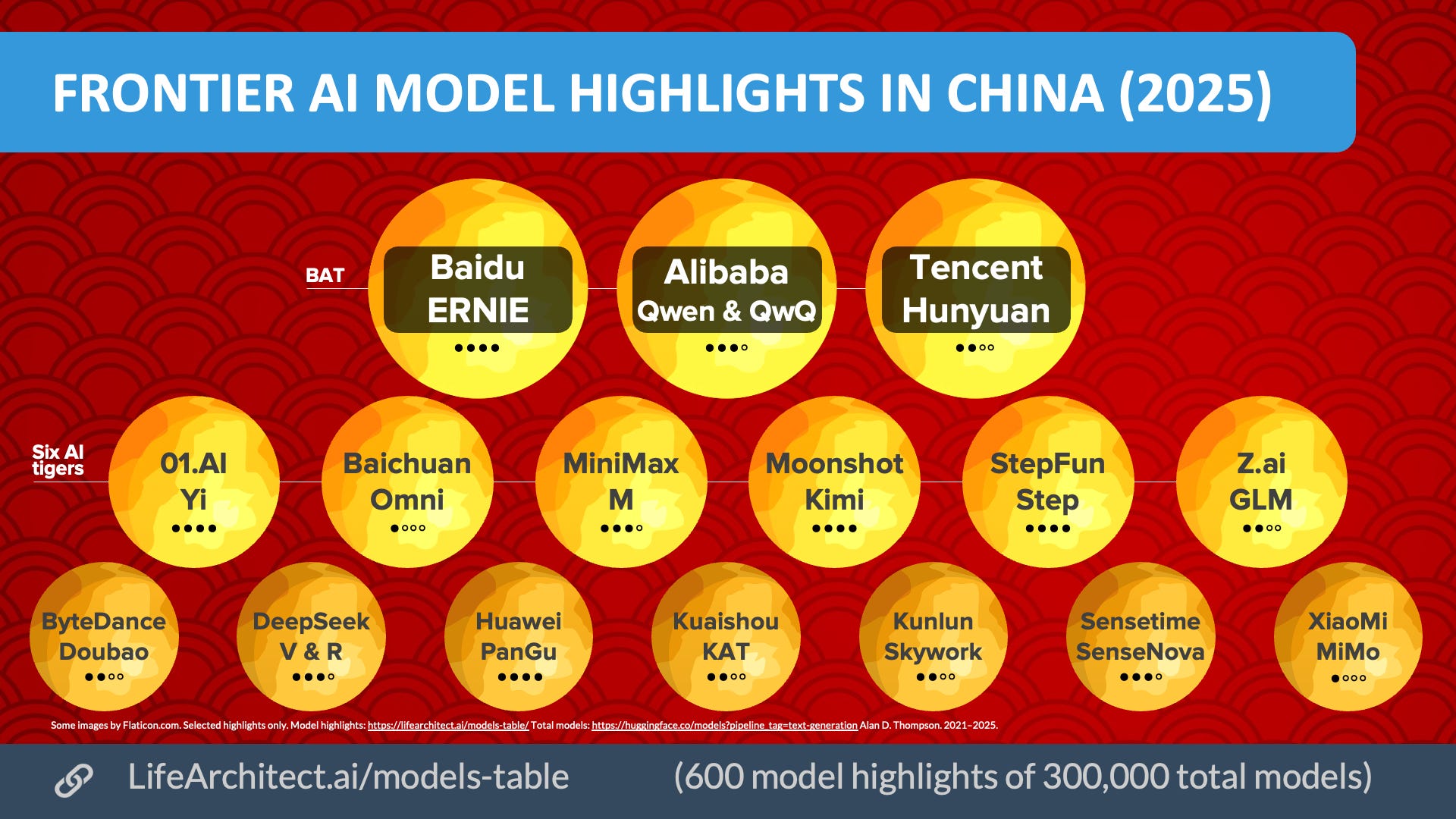 One of the benefits of extended Q&A during workshops and consulting is listening to queries and concerns from around the room. There seems to be a lot of renewed interest in Chinese models, and one of my Fortune 500 clients recently requested a keynote with a focus on this, which led to my new viz. Looking at this alongside the usual Models Table viz (the ‘big 5’ in the US), China has something more like a ‘big 16’, each model comparable with GPT.