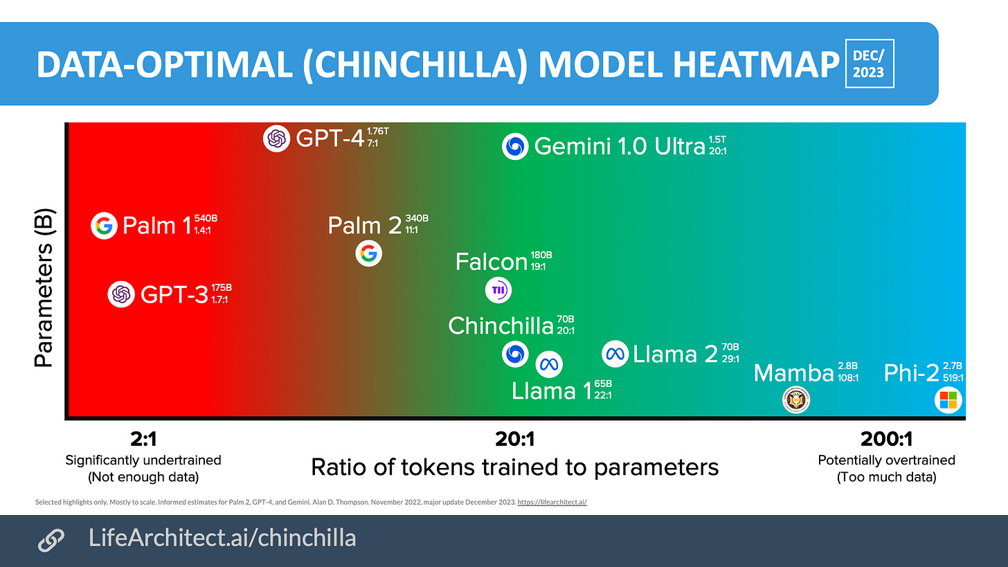 Years ago, my 2022 Chinchilla data viz was published in the paper ‘Current Best Practices for Training LLMs from Scratch’, by Weights & Biases (as used by OpenAI). That viz maxes out at 519:1, so we might have to shift many screens to the right to show this model’s 22,223:1 ratio (or I suppose we could just change the logarithmic scale).
