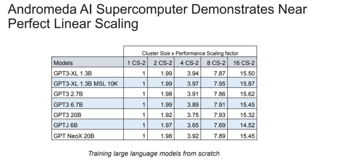 Andromeda delivers 13.5 million AI cores and near perfect linear scaling across the largest language models. It is not really comparable to a standard supercomputer with GPUs. Andromeda is deployed in Santa Clara, California.