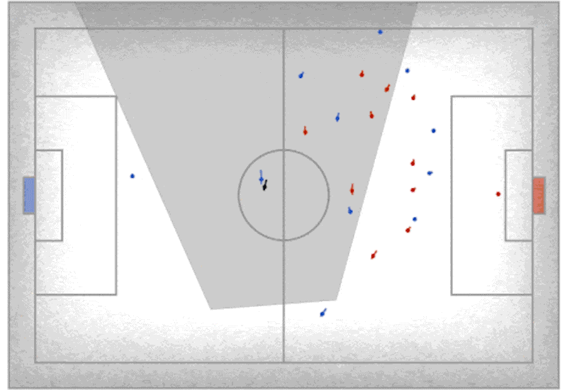 DeepMind’s animation compares the real movements of players during a football match (attackers, dark blue; defenders, dark red) with predictions from a model that forecasts the paths of off-camera players. The grey shaded area is the television camera’s field of view (FOV), which follows the ball (black line). For players outside the FOV, the model predicts the position of attackers (green) and defenders (orange; actual off-camera positions are coloured light blue and pink, respectively).