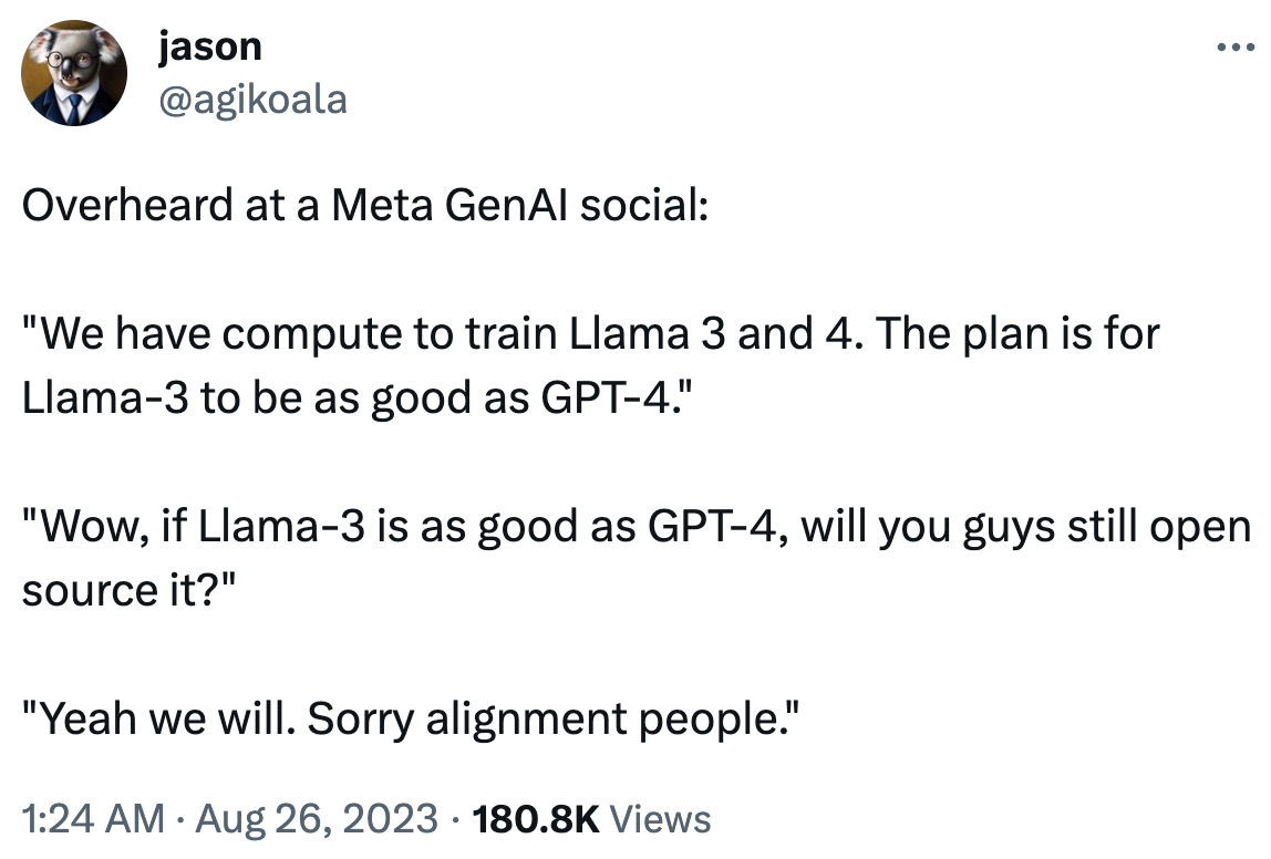 Overheard at a Meta GenAI social: "We have compute to train Llama 3 and 4. The plan is for Llama-3 to be as good as GPT-4." "Wow, if Llama-3 is as good as GPT-4, will you guys still open source it?" "Yeah we will. Sorry alignment people."