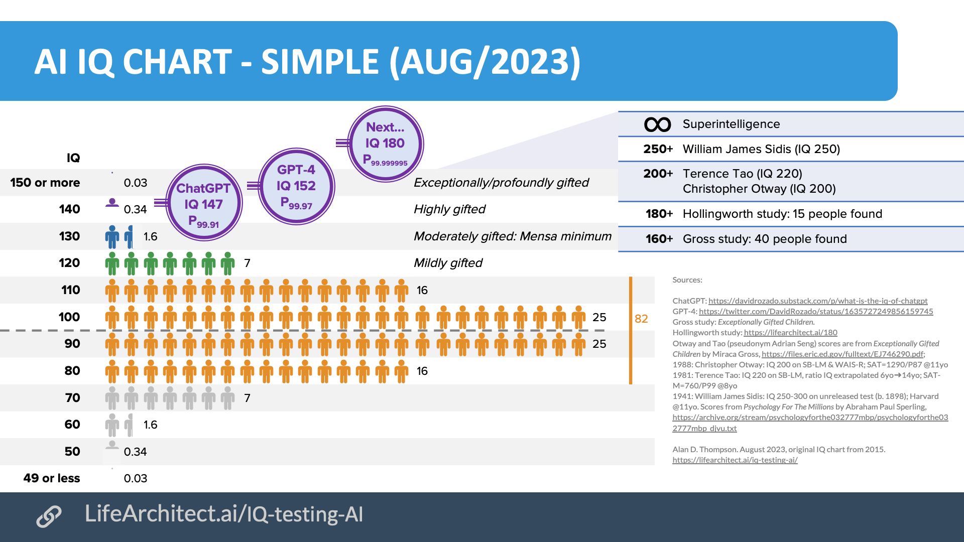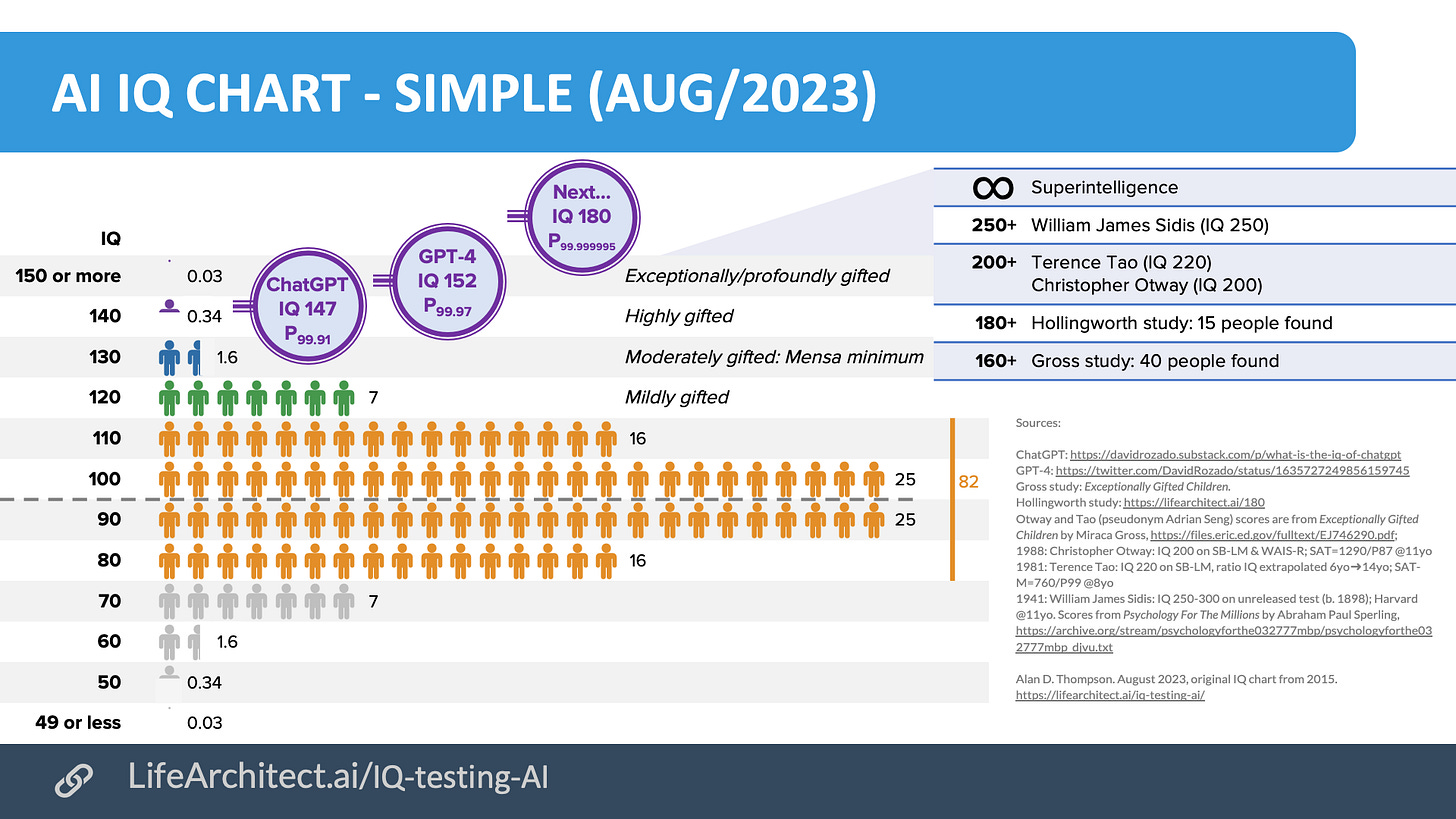 While I’ve used NZ Professor David Rozado’s GPT testing results here, it’s worth noting that in Mar/2023, clinical psychologist Eka Roivainen used the widely-accepted WAIS III instrument (Wechsler Adult Intelligence Scale, Third Edition) to assess the model via the ChatGPT interface (assuming GPT-4). The result was nearly the same: an IQ of 155, which puts it in the 99.987th percentile of the human population.