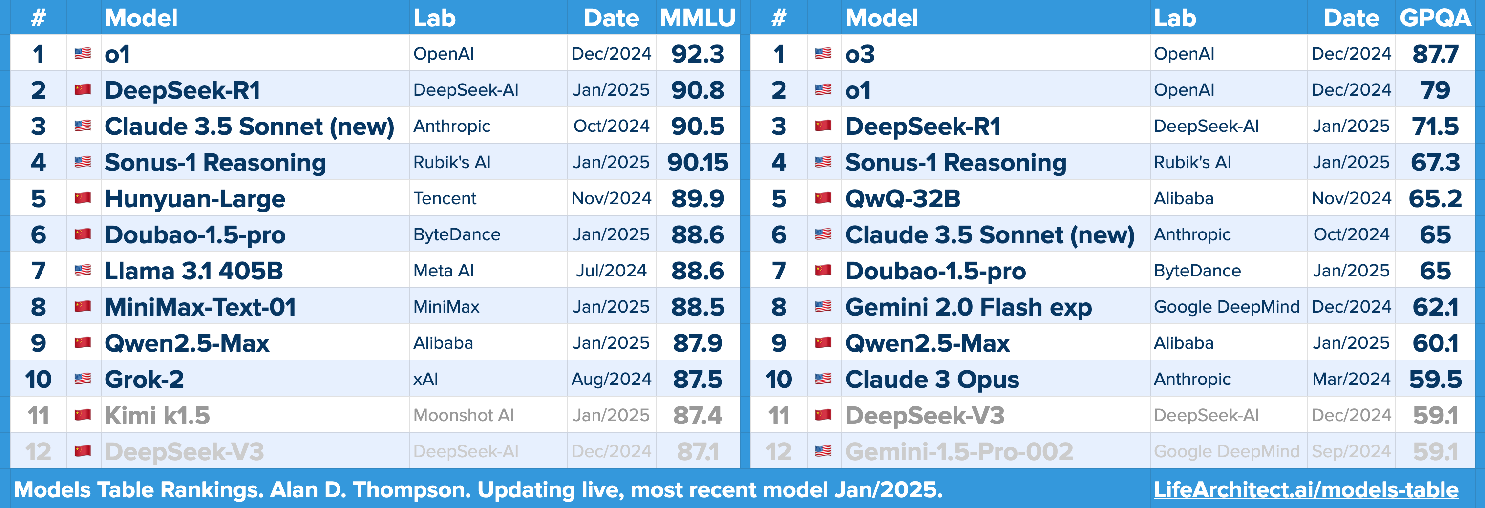 Readers of The Memo will be unsurprised by the continuing success of Chinese AI labs, as we’ve been covering China since day one. This month, Chinese AI labs launched five different frontier models (updated after this edition went out: R1, Doubao-1.5-pro, Qwen2.5-Max, MiniMax, k1.5), with most of them taking positions in the top 10 models worldwide. This is easily visible in my new Models Table Rankings (updated live): https://lifearchitect.ai/models-table/