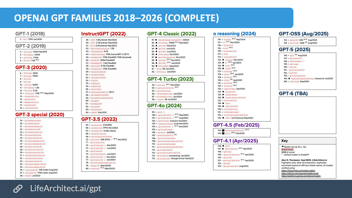 And here’s a new poster showing 165 text models across all the OpenAI GPT families, starting with GPT-1 in 2018, with a placeholder for the upcoming GPT-6.