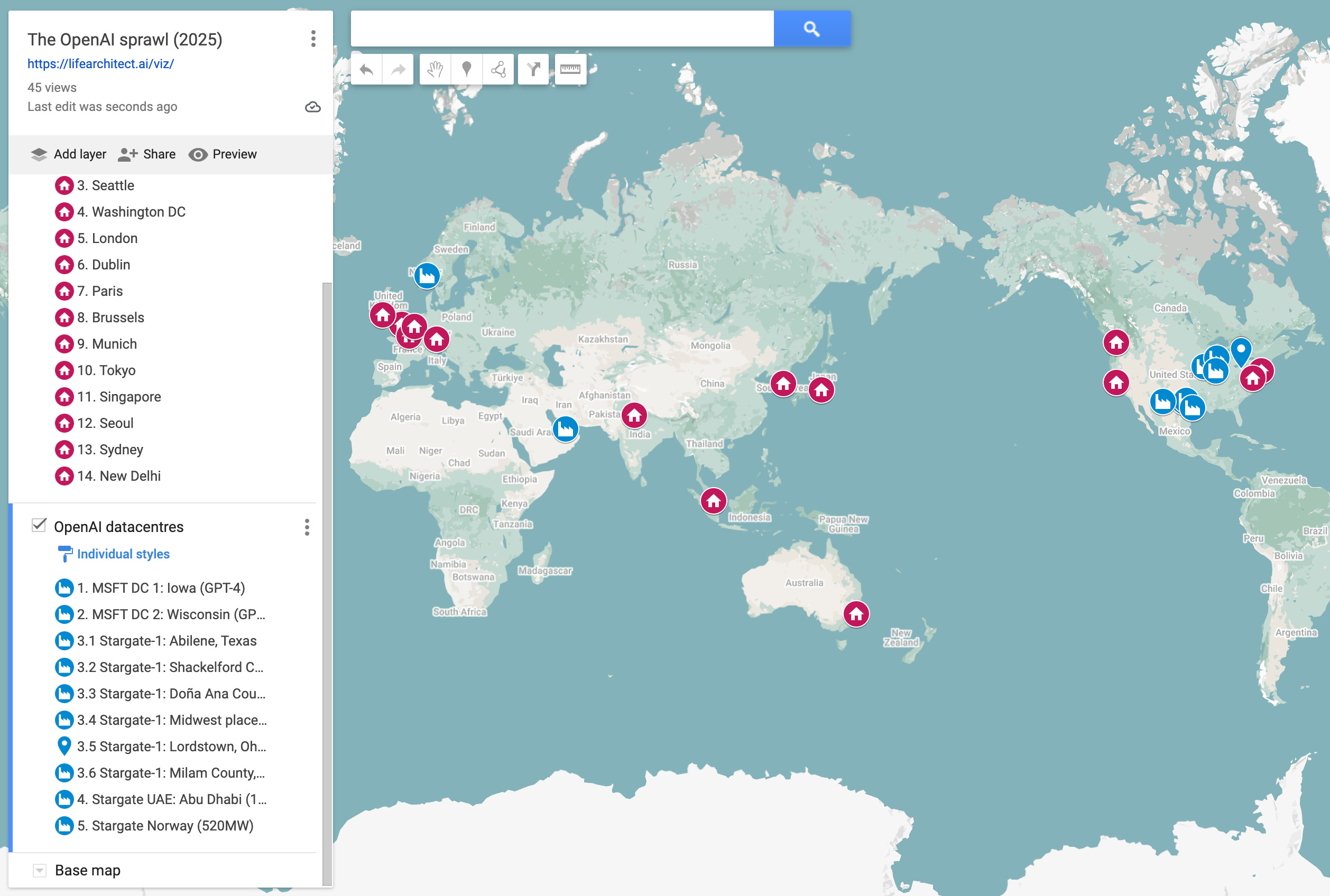 I’ve been on an OpenAI analysis spree (now valued at $500B) recently, and here are two exclusives. First, OpenAI’s sprawl over the last couple of years has been spectacular, now with 14 offices, and 10 major Stargate datacentres measured in gigawatts (plus the original two major Microsoft datacentres used to train GPT-4 and GPT-5).