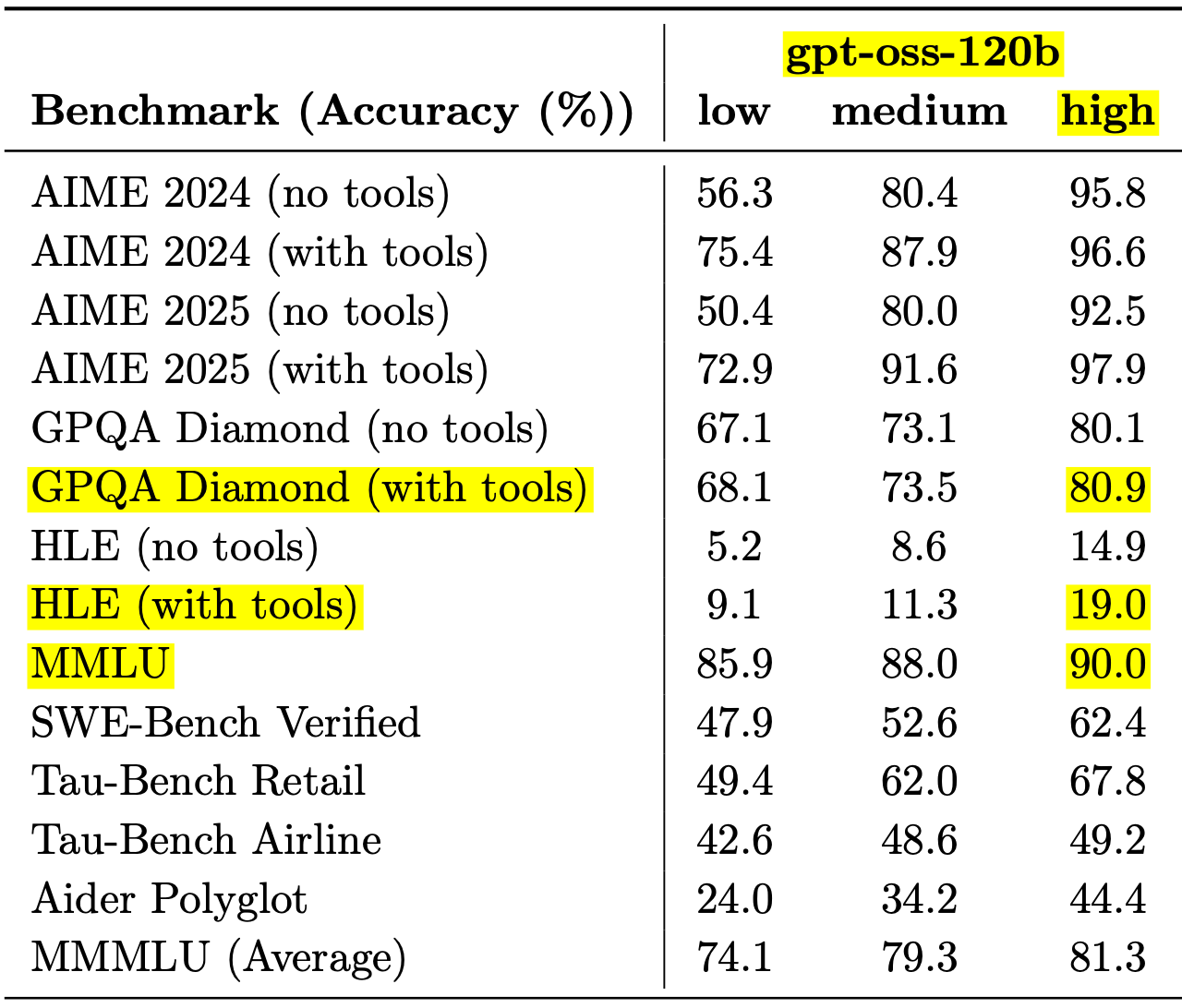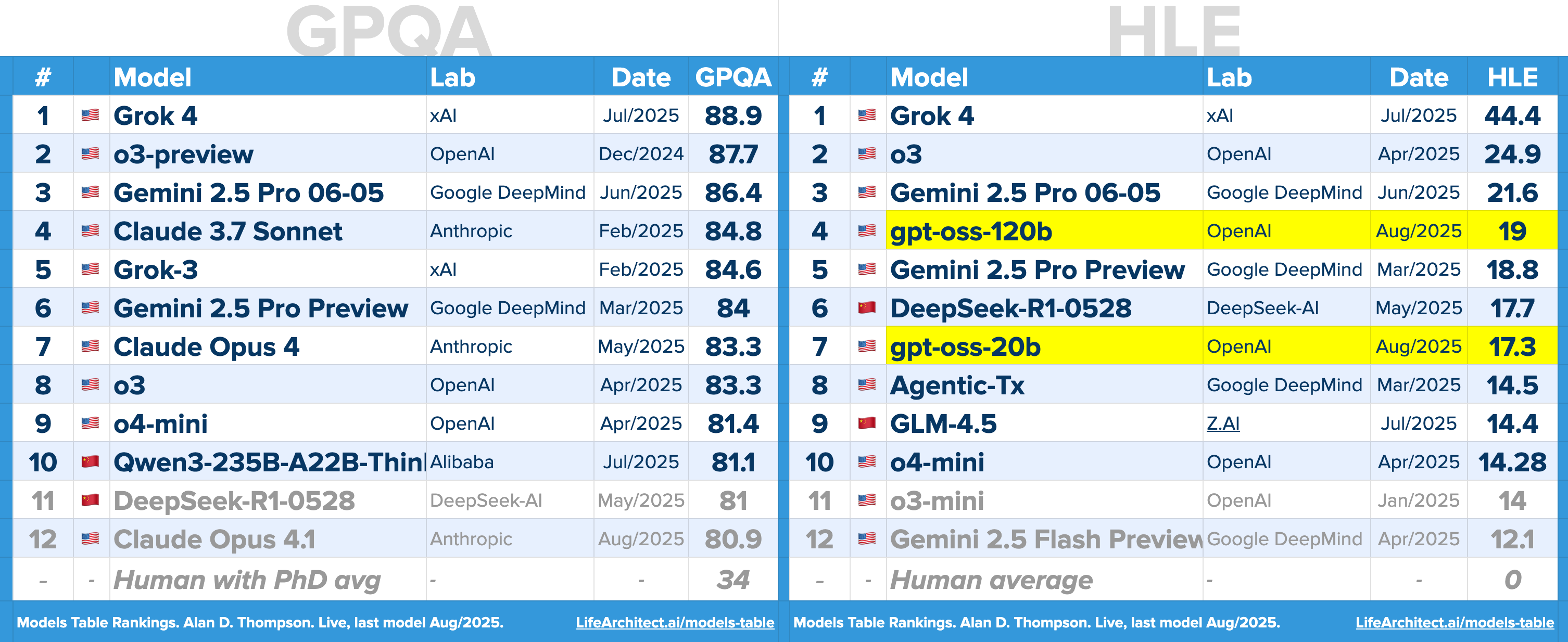 GPT-OSS-120B scored MMLU=90, GPQA=80.9, HLE=19. For comparison, ChatGPT’s initial GPT-4o model scored MMLU=88.7, GPQA=53.6. GPT-OSS is approaching (MMLU) or hitting (GPQA) the test ceilings for ‘uncontroversially correct’ answers.